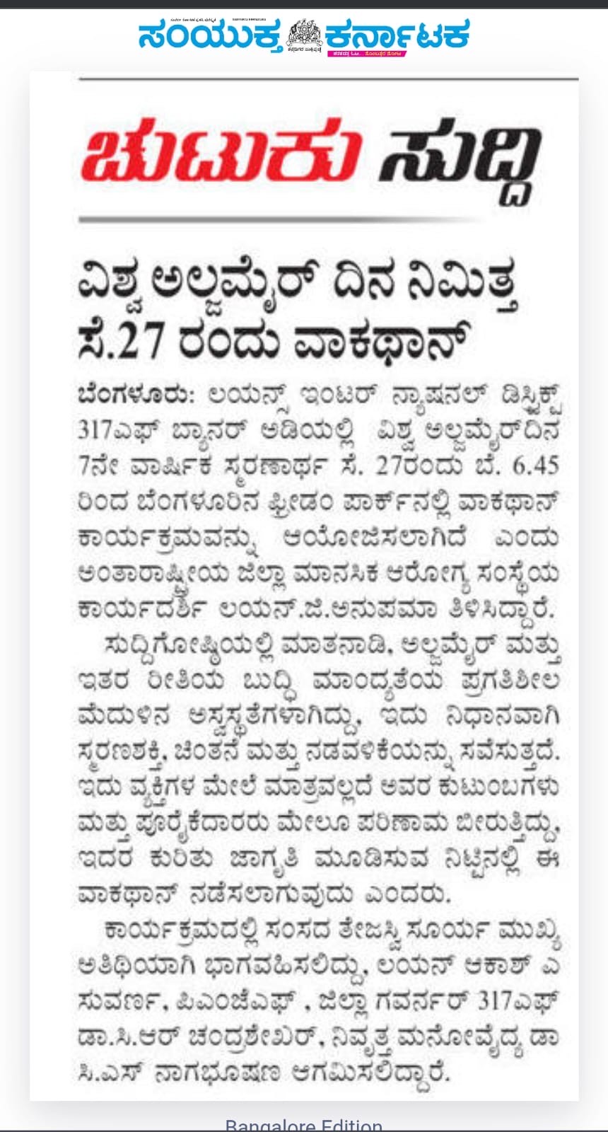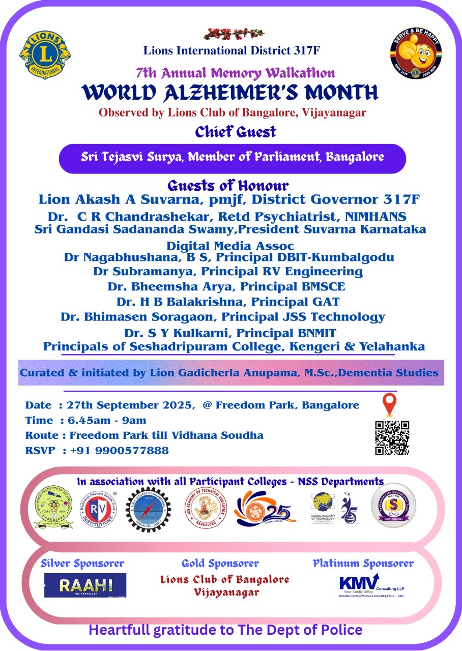 The Lions Club of Vijayanagar, Dist. 317 F, is dedicated to raising awareness about Alzheimer’s disease through impactful events and community outreach. We work to support research, educate caregivers, and promote early diagnosis for a healthier, dementia-free future.