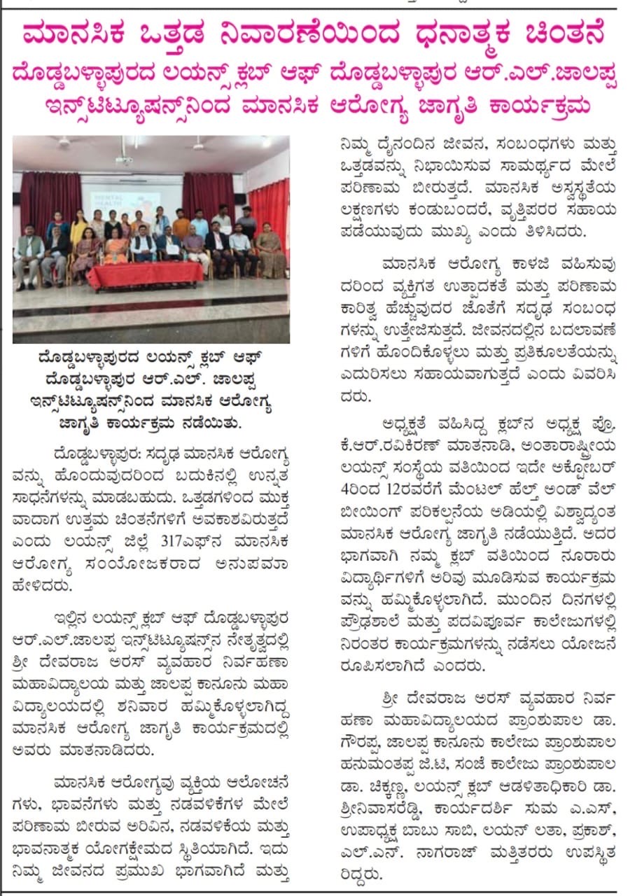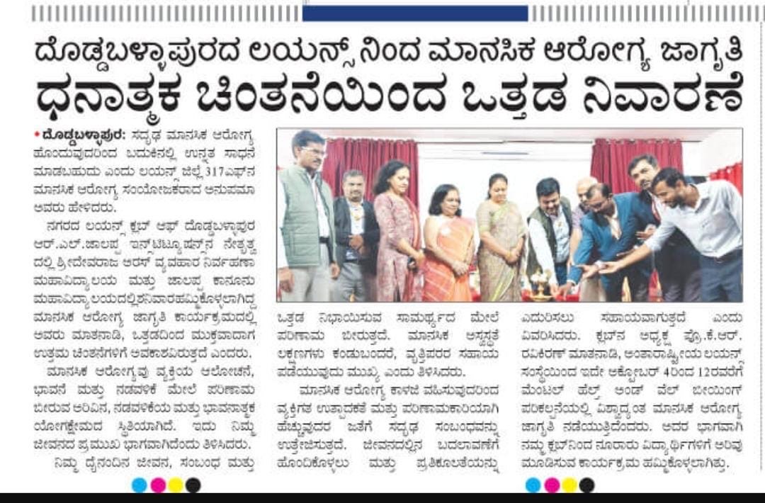 Dr Umashanka B S, principal Don Bosco Institute of Technology and Initiator Lion G Anupama . MJF, DC Mental Health have inaugurated the event. Dr Kumaraswamy, PED, DBIT organising chair, Professor Dr G Vishnu Vardhan, Lion B S Rajashekharaiah pmjf, Dist Governor, Rtn Sameer Gupta, President RCBC, Rtn Wg Com Dharam Paul, Chairman, ADRAG India and Professor Raghavendra D, DBIT have present during the occasion.